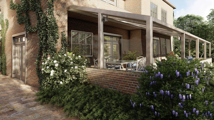 Progettazione e design degli esterni per una villa di campagna. Il patio si sviluppa attraverso una pergola bioclimatica e garantisce continuità spaziale alla sala da pranzo ed alla cucina creando così uno spazio aggiuntivo connettendosi direttamente al cortile e al giardino.